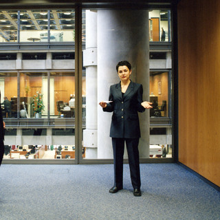 Diving into the black hole’s inky waters, artist Carey Young navigates their Sargasso depths with deft agility. Resurfacing, she confronts the suspect economic and political associations architecture has developed, responding to the merging lexicons of business and creative spheres15. Young’s I am a Revolutionary (2001) reveals the relationship between linguistic manipulation and Deleuzian introversion, divulging both the absolution of the artist’s creative autonomy and its subsequent possession by corporate entities. Illuminating the now one dimensional nature of the term ‘revolutionary’ Young exposes the ease with which, through repetition, language is strengthened to serve specific agendas, be they financial or architectural. Young’s quest to convince her audience that she is, in fact, a revolutionary indicates the often self-proclaimed nature of this title. Drained of its significance, Young’s repetitive rehearsal points to the sinister face of corporate servility. ‘Revolution’ has now become ubiquitous as Young’s line ‘I am a revolutionary’ may be “rehearsed by anyone until they sound convincing”16. Are corporations now militarized training arenas, existing to create anonymous revolutionaries? Have they become the new avant-garde? Young confronts these issues. Political and economic activity are now inseparable from her work’s identity. They are tropes present at the conception of her art and their a!voidance is impossible.